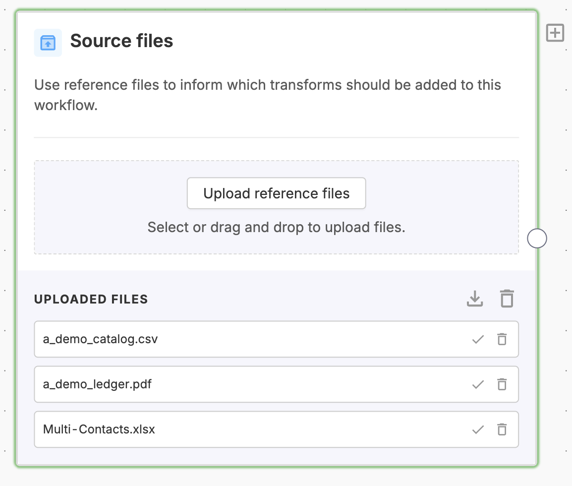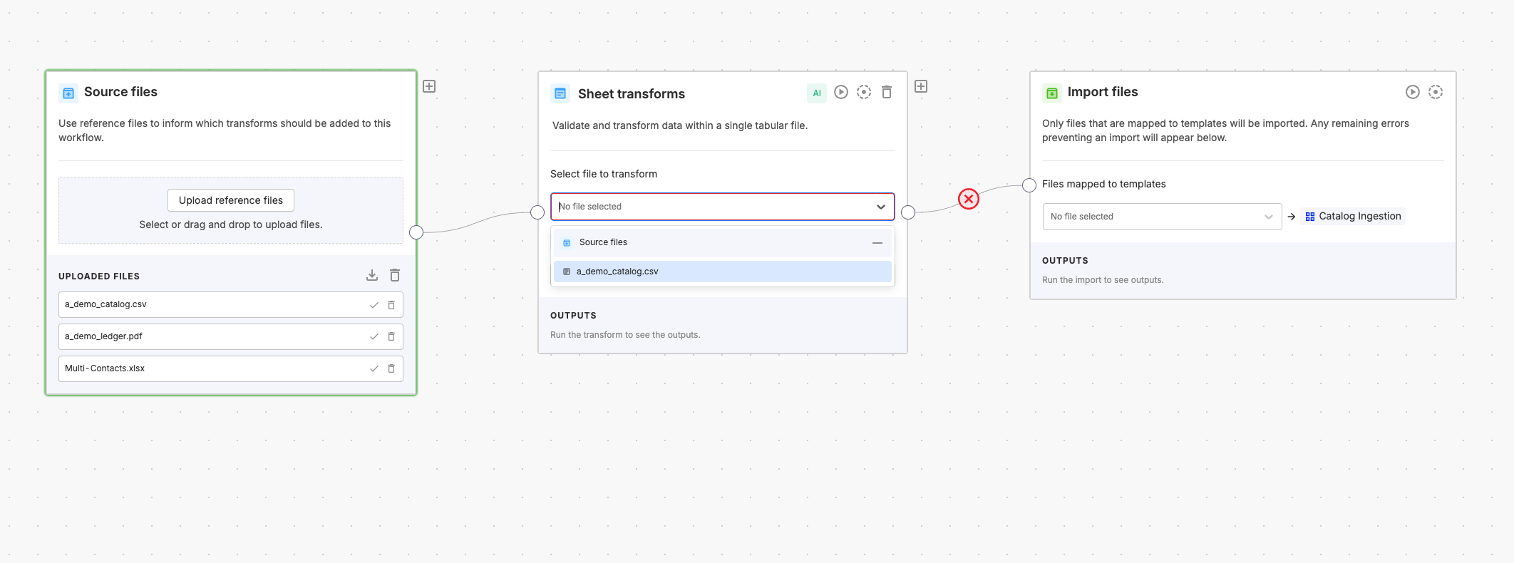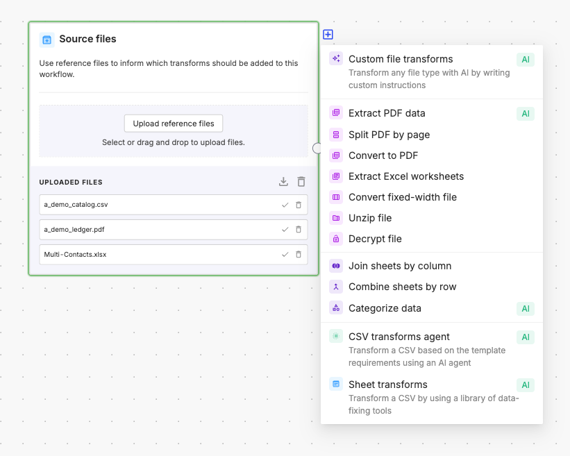 In order to build the path between Source files and Import files, hover the plus icon in the top right corner of a block to access the transforms menu. Our entire library of blocks ranging from Extract PDF data to Custom file transform and Sheet transform are all available as blocks for you to add.