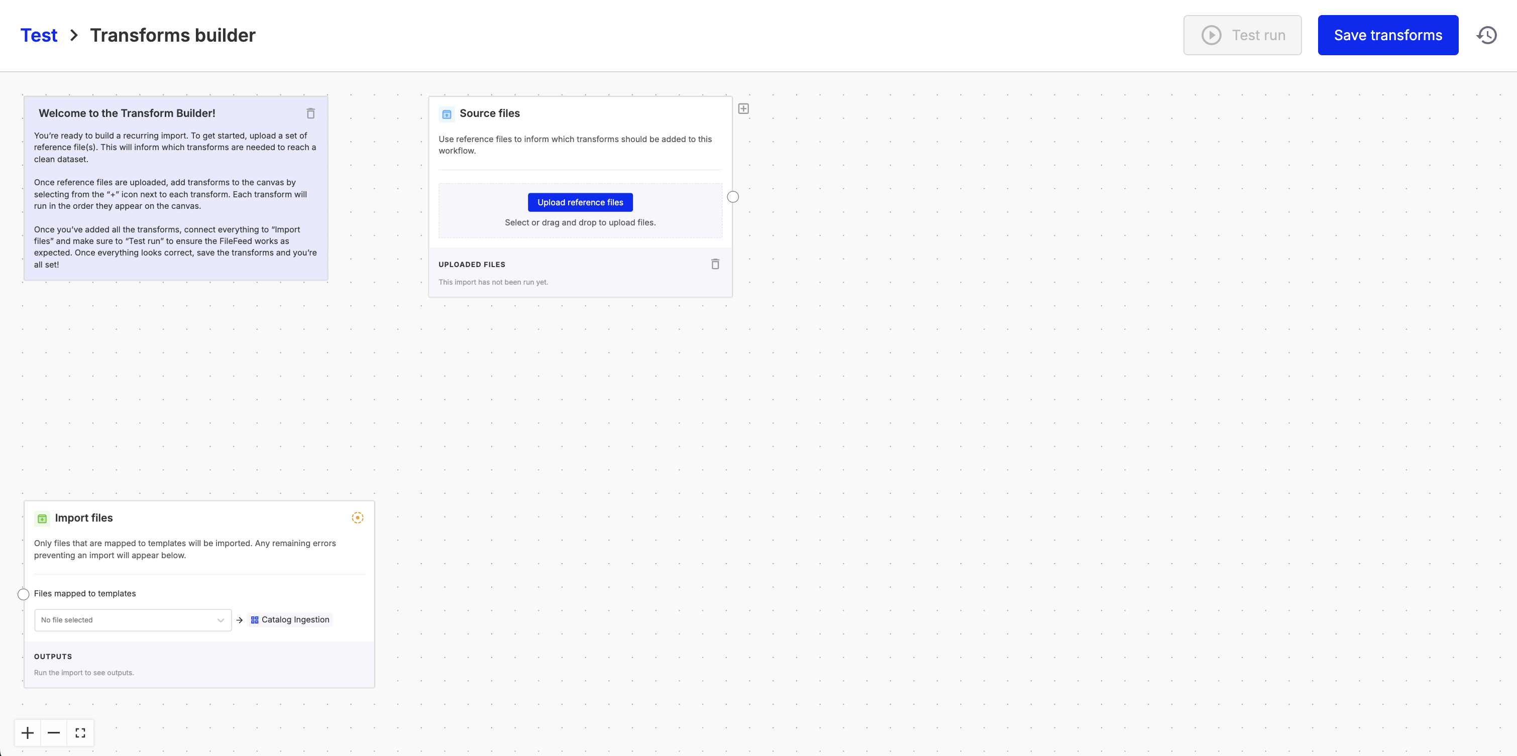 The transform builder canvas allows you to define a flexible transformation path for files entering the FileFeed. Files always begin at Source files and end at Import files. That is why these two blocks are available from the moment you create your FileFeed.