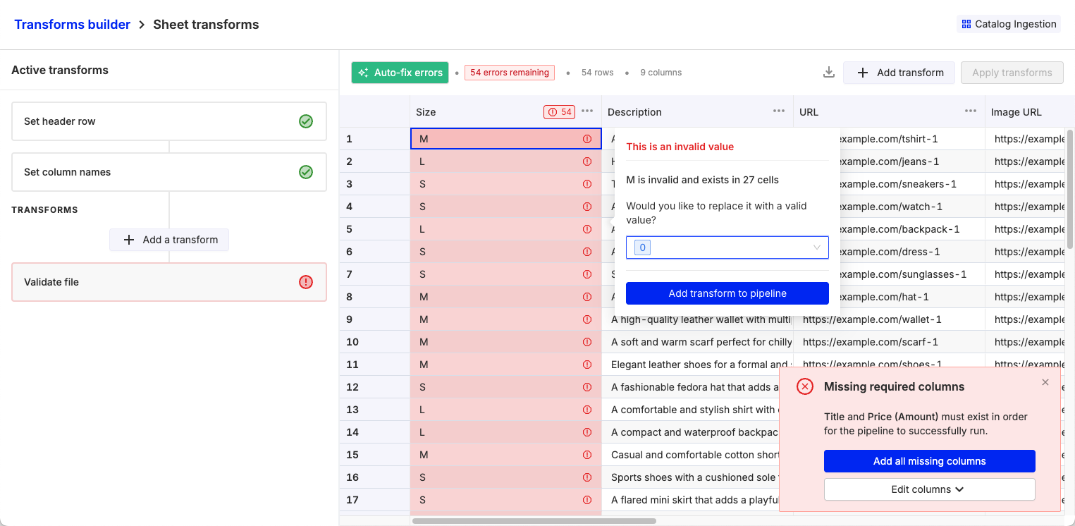 The sheet transform displays the validation errors between the template and the CSV / sheet that was used as the reference file. Clicking on the red cells will display an error message and also suggest transforms that can be added to the saved transforms on the left sidebar. Clicking "Add a transform" will also open the transform menu, allowing you to access AI transforms directly for cleaning the spreadsheet. Clicking "Auto-fix errors" will also apply default formatting fixes for dates, text casing, numbers, etc.