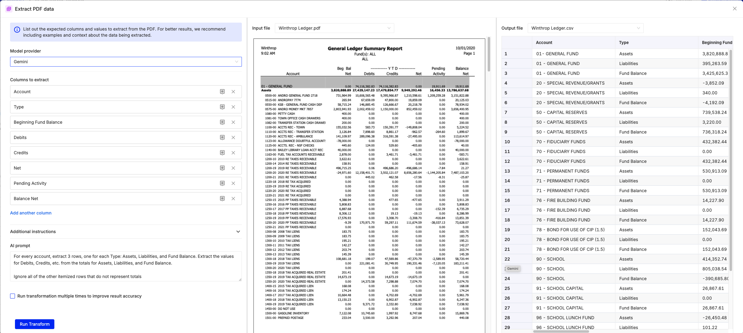 The extract PDF transform allows you to extract structured data from any PDF, image, or word document. We offer a choice of AI models as well as an easy to use extraction UI. Simply define the headers you are looking for and AI will handle the rest.