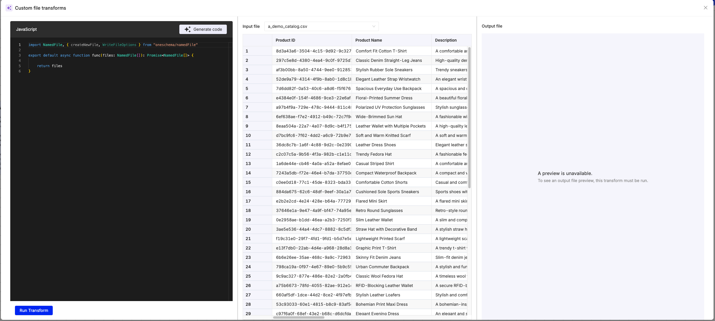 The custom file transform gives a user all the power of an AI-powered vibe coding experience. With just natural language, any non-technical user can create file transforms for unzipping files, transposing columns and rows, converting XML files to CSVs, etc.